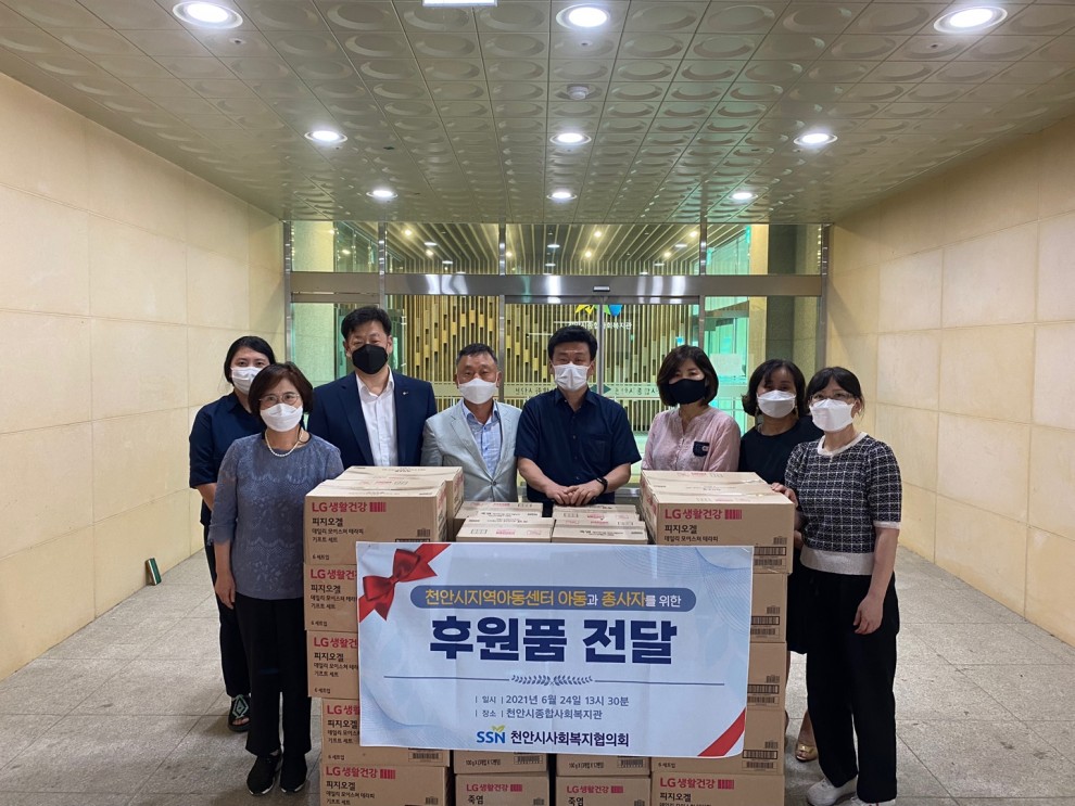 천안시사회복지협의회에서는 2021년 6월24일 천안시종합사회복지관 에서 후원품 전달을 진행 하였다. 천안사회복지협의회 회장 천선호, 천안시종합복지관 관장 문명희, 기독성심원 원장 이응덕, 천안시지역아동센터 연합회 부회장 전근성, 그리고 각 지역아동 센터장들과 간단회를 진행하고 화장품 및 치약 등 생필품을 전달하였습니다. 61개 지역아동센터 아동들과 종사자를 위한 나눔을 함께 하였습니다.